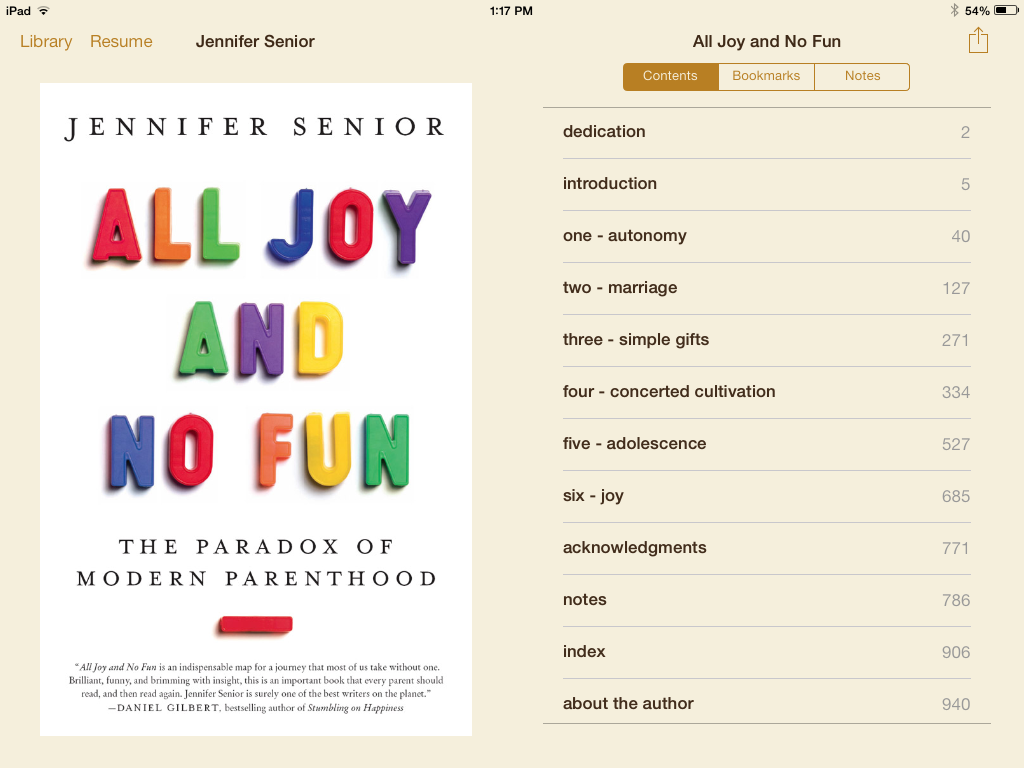 All Joy and No Fun is not a book about parents’ effects on their children. It’s a book about how parenting affects us. For it, the author, Jennifer Senior, visited with parents, “listening to them talk about their lives” and observing them in parenting action. She also did abundant research; the interviews bring that research to life.